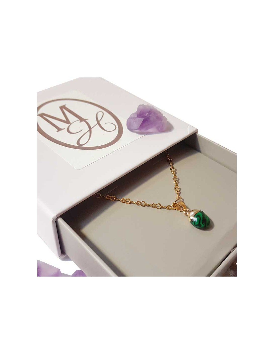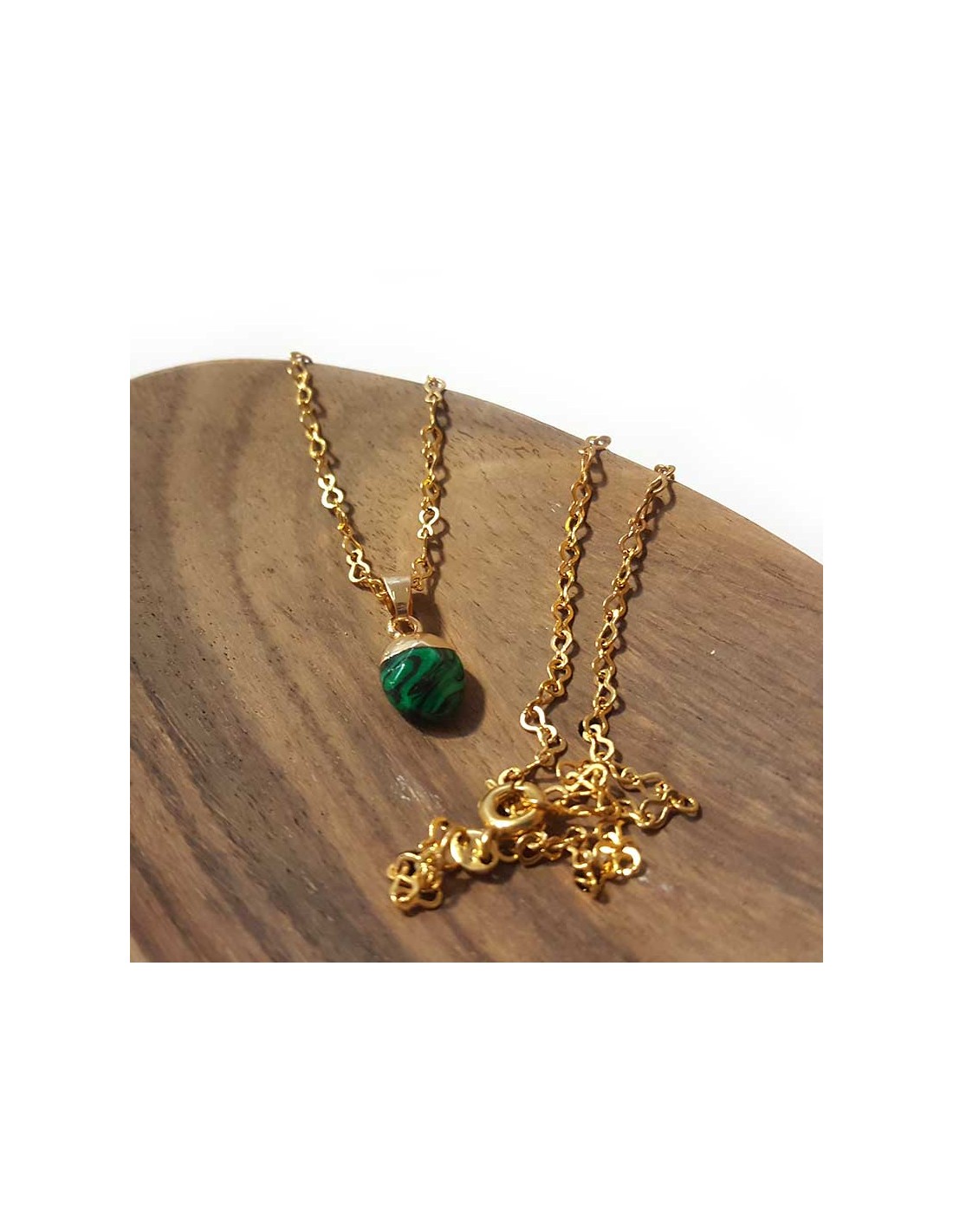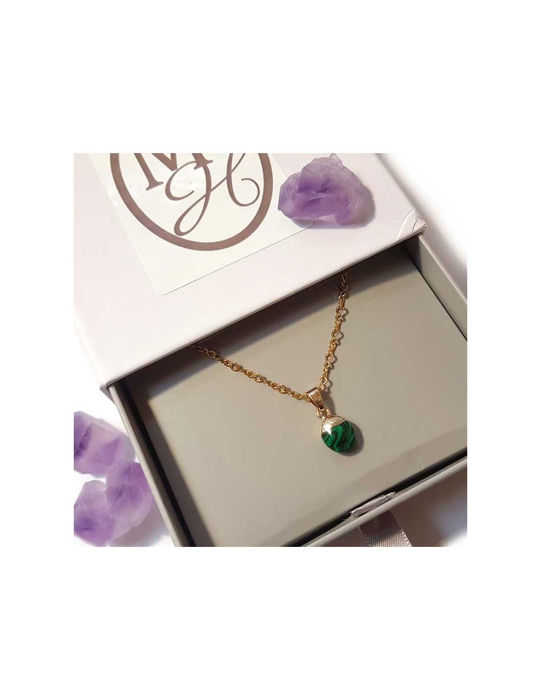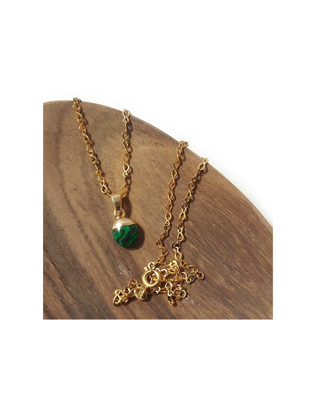 Deze malachiet hanger is discreet en charmant. De synthetische steen is aan de bovenkant verguld, delicaat geslepen in een druppelvorm en gefacetteerd. De vergulde ketting is inbegrepen.