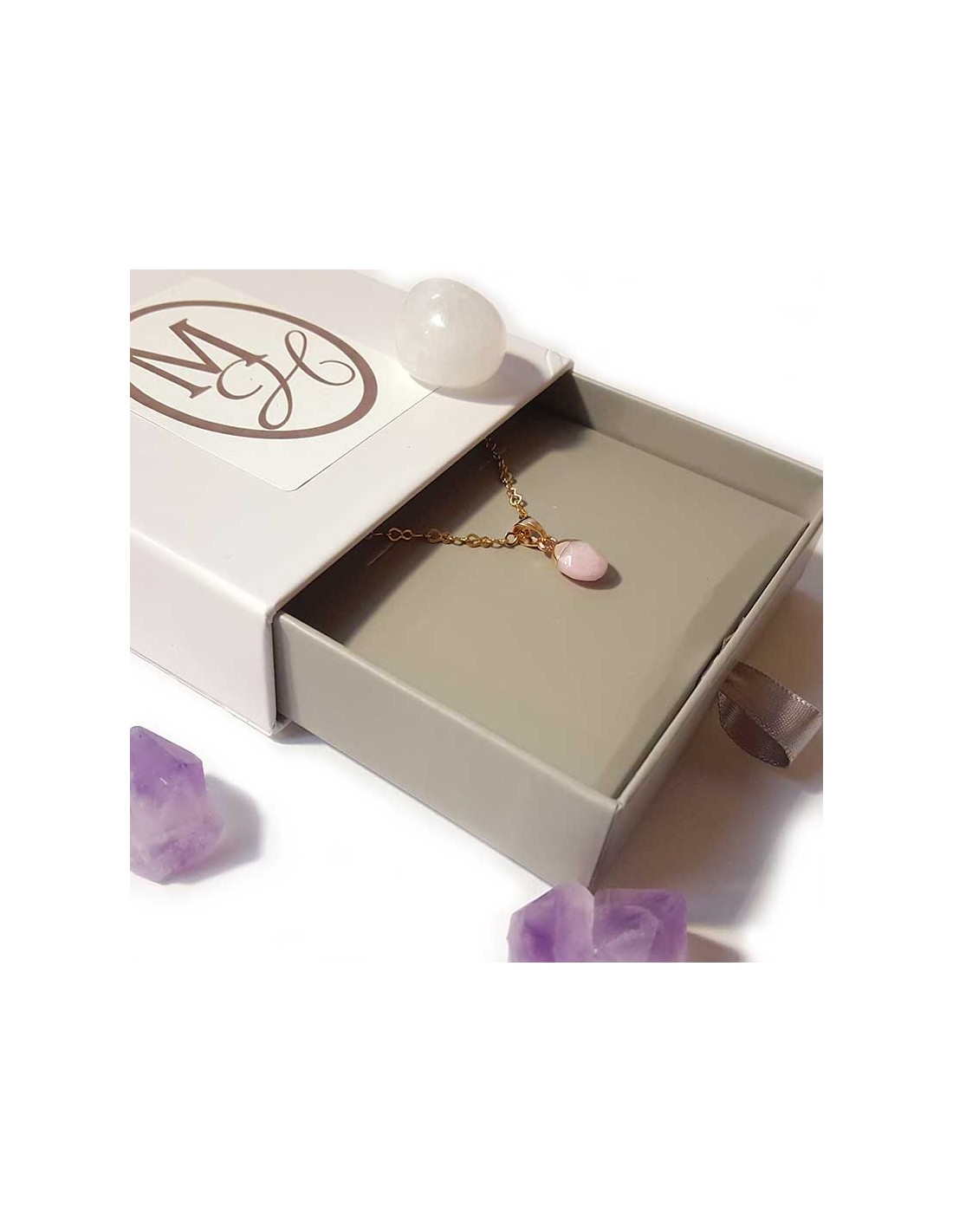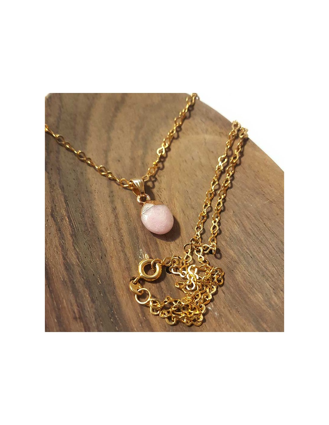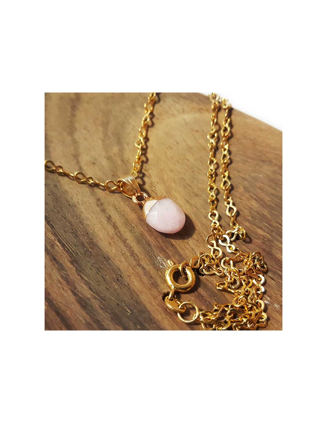 Deze roze jaspis hanger is discreet en charmant. De synthetische steen is aan de bovenkant verguld, delicaat geslepen in een druppelvorm en gefacetteerd. De vergulde ketting is inbegrepen.