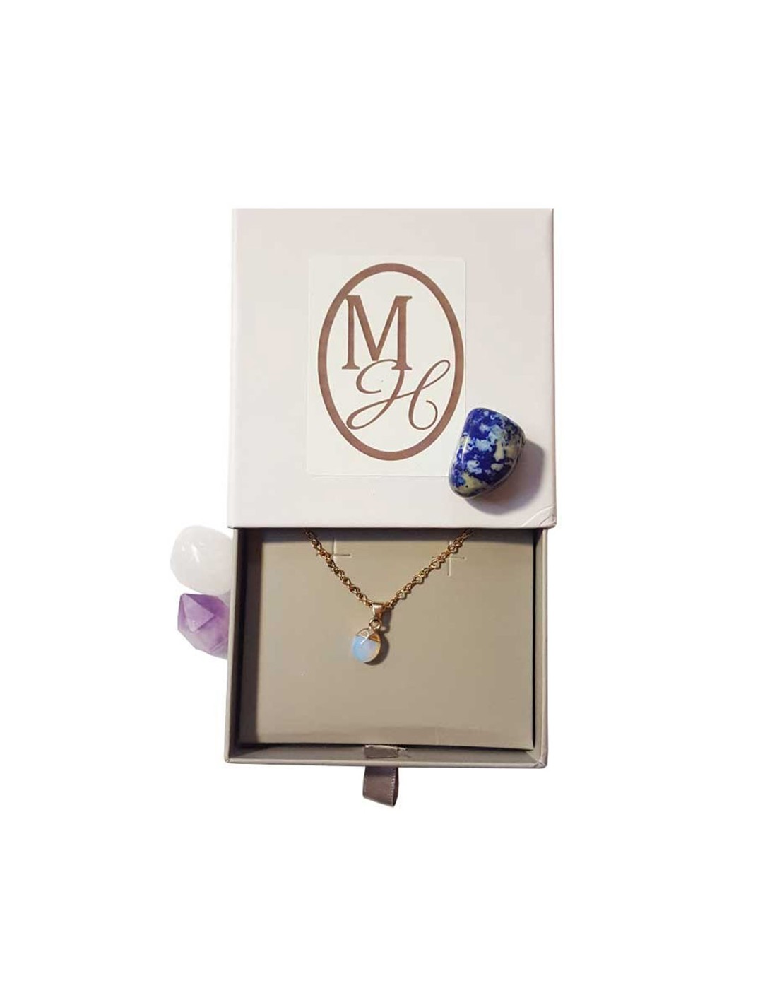 Deze opaline hanger is discreet en charmant. De synthetische steen is aan de bovenkant verguld, delicaat geslepen in een druppelvorm en gefacetteerd. De vergulde ketting is inbegrepen.