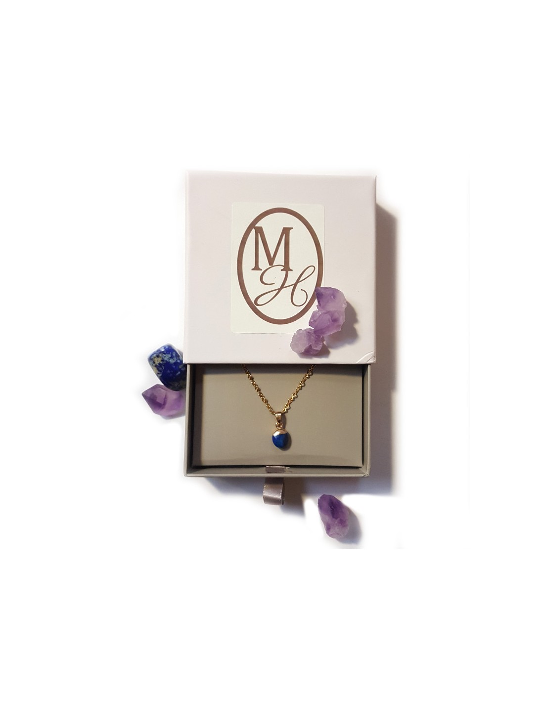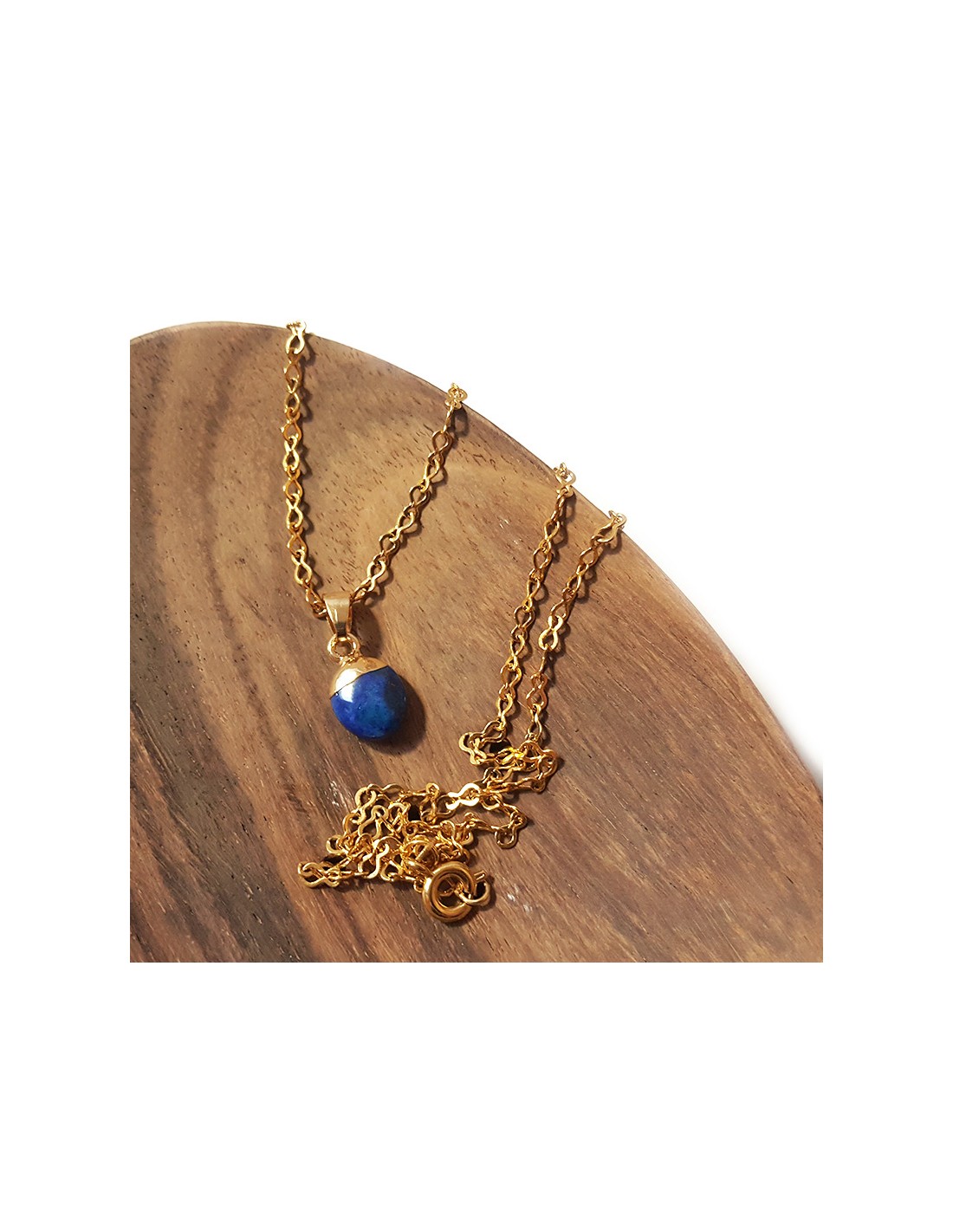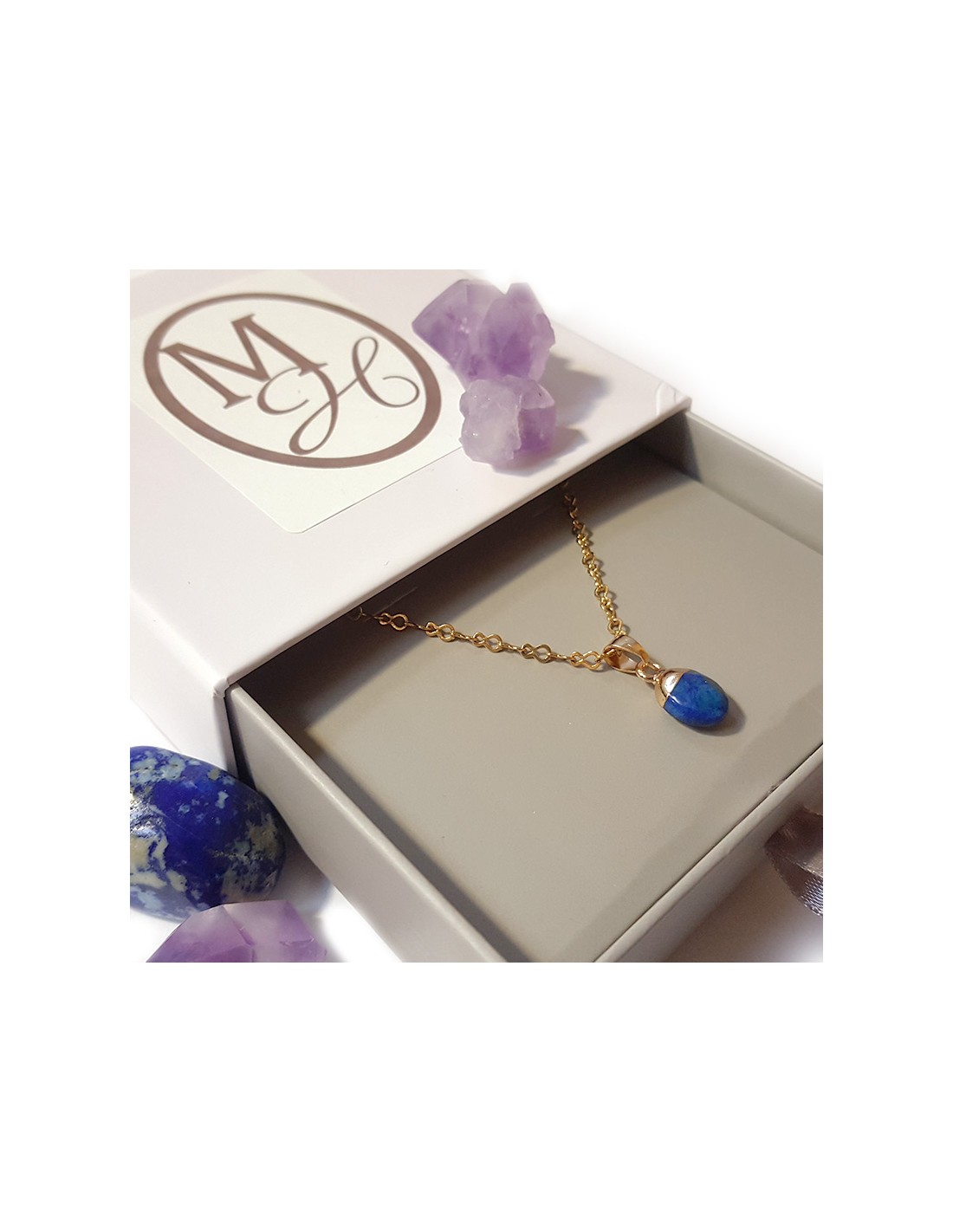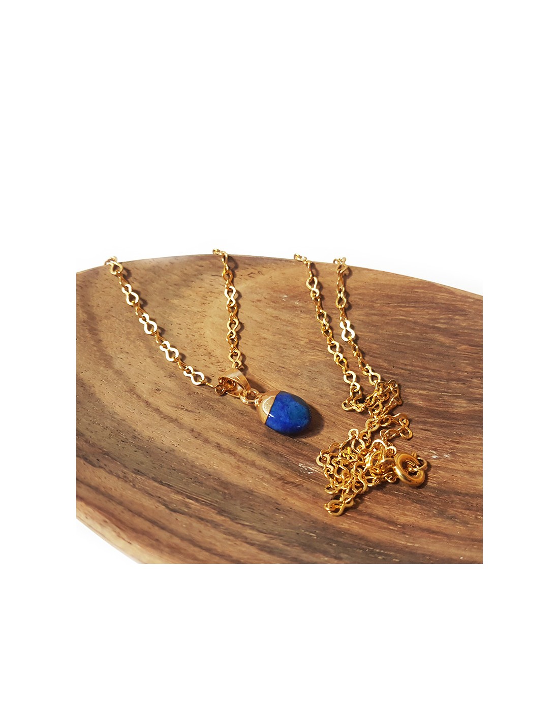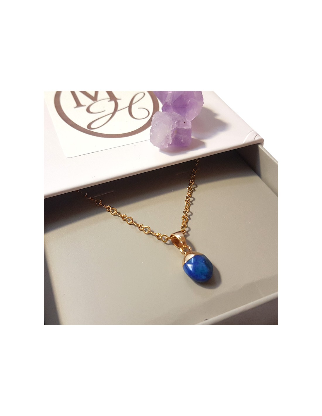 Deze hanger van lapis lazuli is discreet en charmant. De steen is bovenaan verguld, delicaat geslepen in een druppelvorm en facetgeslepen. De vergulde ketting is inbegrepen.
