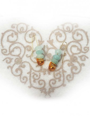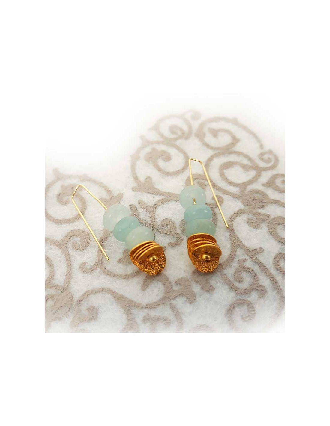 Deze bungelende oorbellen zijn slank en elegant, terwijl ze een natuurlijk en exotisch tintje geven. Versierd met drie facetgeslepen blauwe jadekralen en goudkleurige chips, passen ze overal bij.