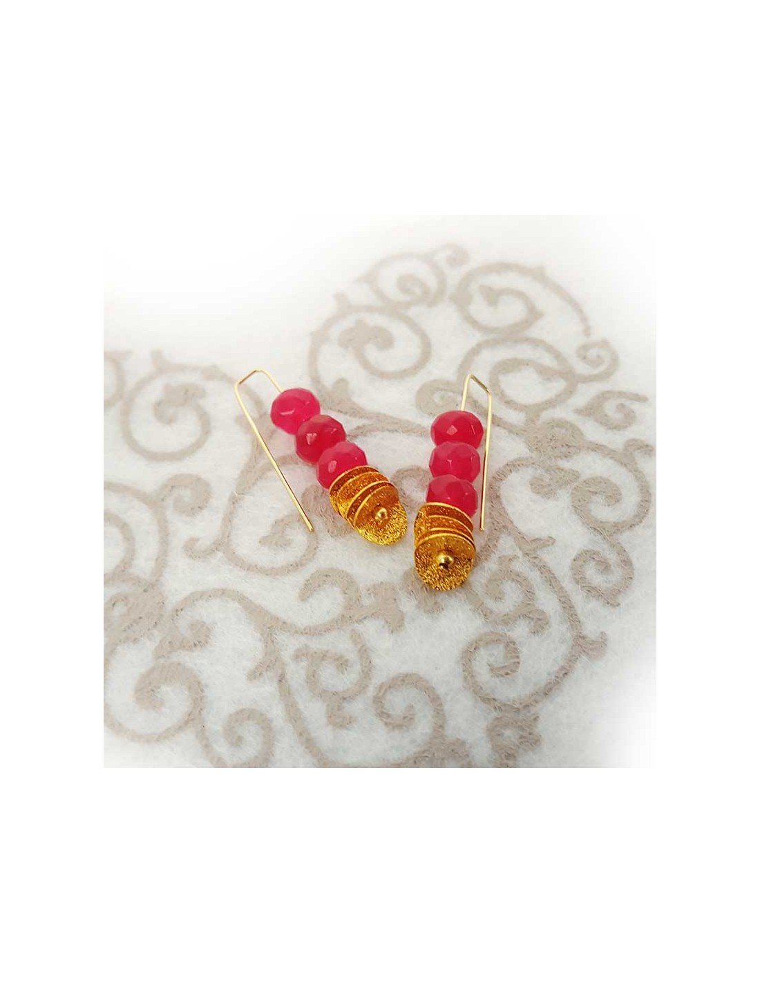 Deze bungelende oorbellen zijn fijn en elegant en brengen een natuurlijke en exotische toets. Versierd met drie gefacetteerde roze jadekralen en gouden chips, passen ze overal bij.