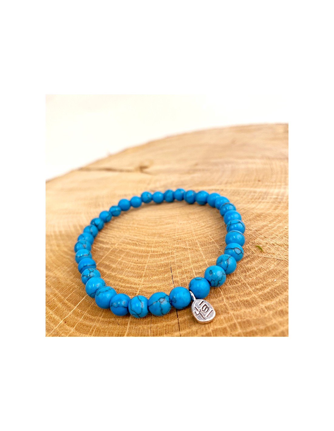 Elastische draad armband gemaakt van turkoois, een fijne steen. Vergezeld van een klein zilveren bedeltje, geeft deze armband een zachte en serene toets aan uw pols.