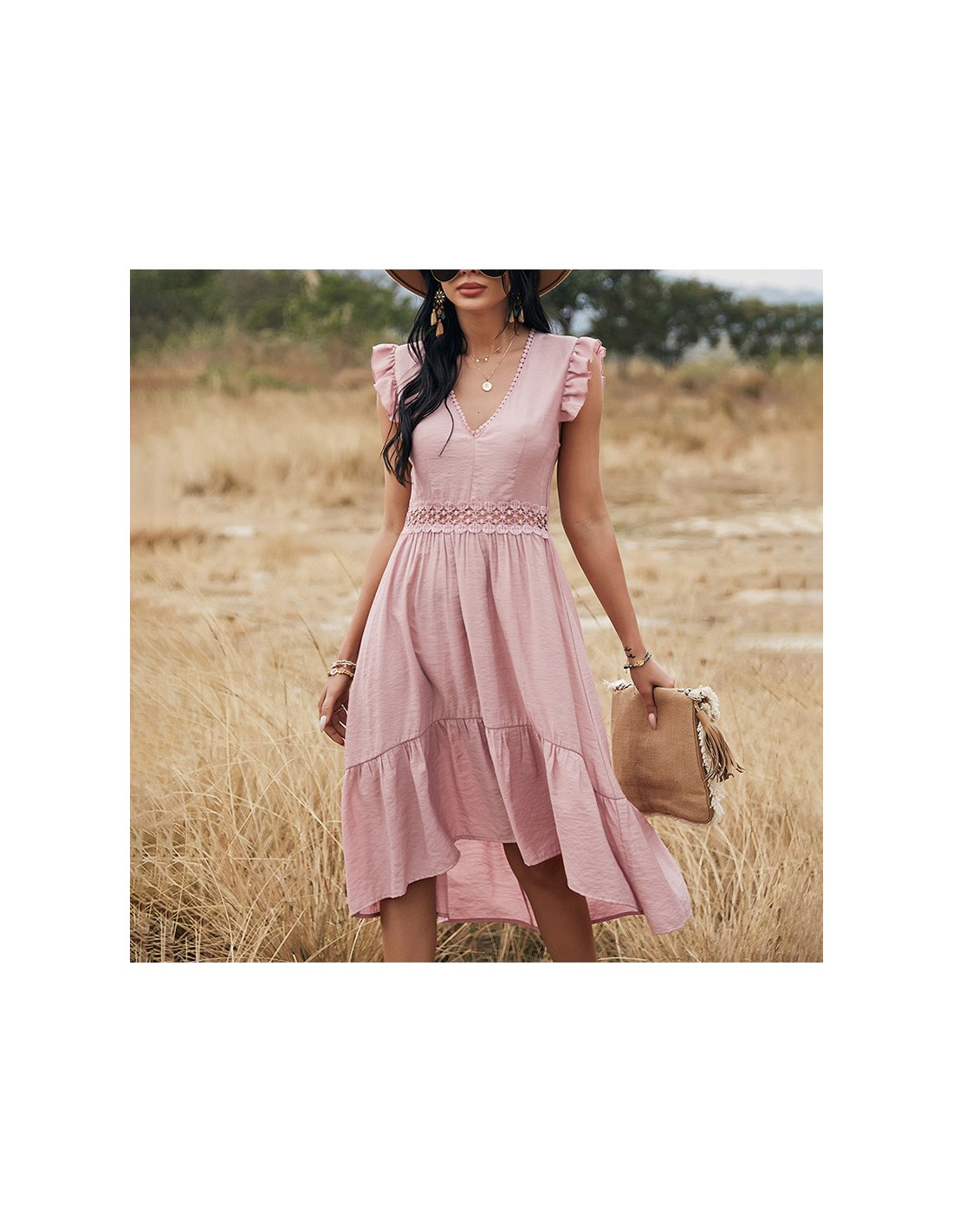 Roze jurk met gehaakte kanten ruches en V-hals