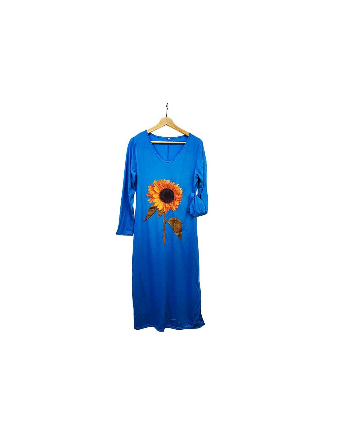 Lange blauwe jurk van polyester, met een grote zonnebloem op de voorkant gedrukt. Een typische jurk van de bohemien geest.
