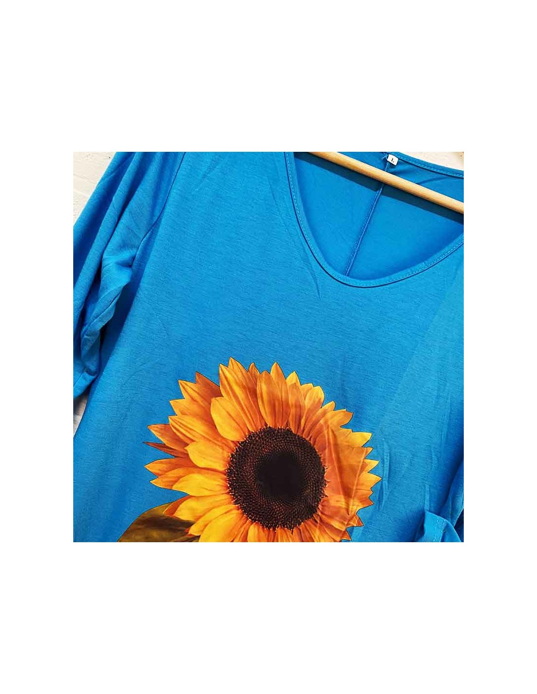 Deze lange, comfortabele jurk heeft een eenvoudige en tijdloze snit. De mouwen zijn lang, de wijde U-vormige halslijn laat de hals ademen en de zijsplit maakt de jurk licht en luchtig. Een grote zonnebloem in glinsterende kleuren is op de voorkant van de jurk gedrukt.