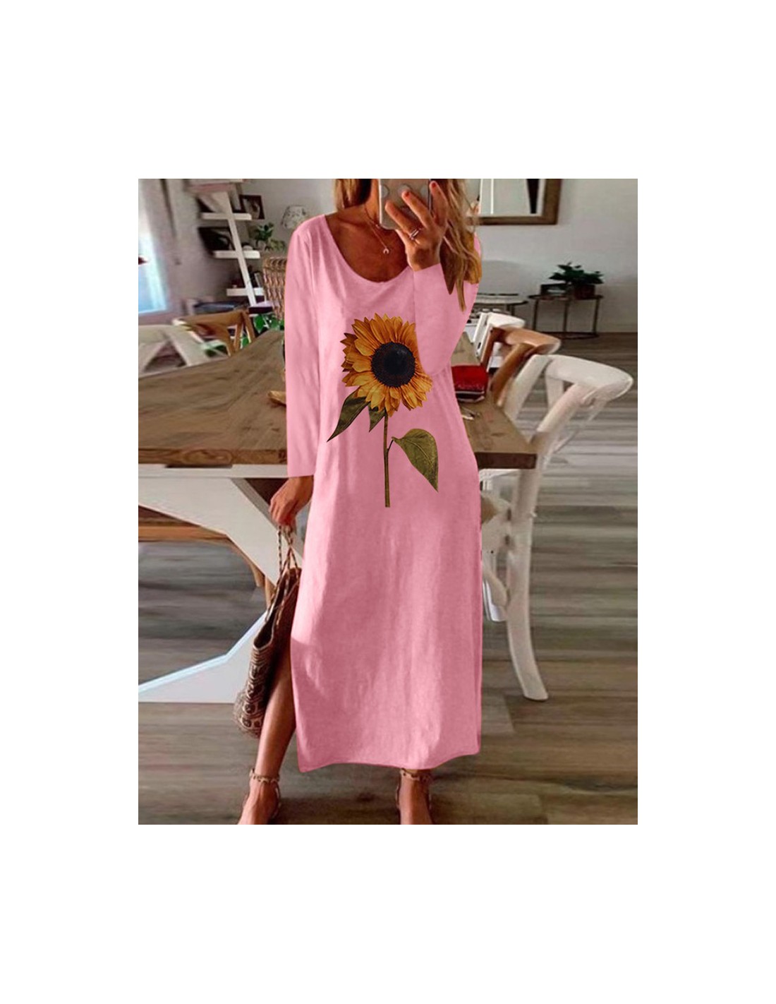 Deze lange, comfortabele jurk heeft een eenvoudige en tijdloze snit. De mouwen zijn lang, de wijde U-vormige halslijn laat de hals ademen en de zijsplit maakt de jurk licht en luchtig. Een grote zonnebloem in glinsterende kleuren is op de voorkant van de jurk gedrukt.