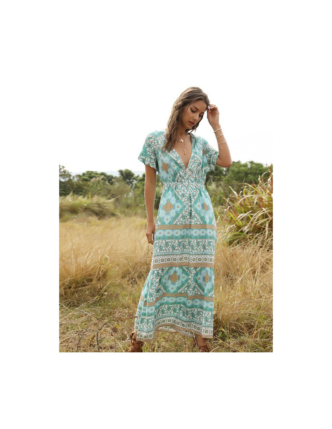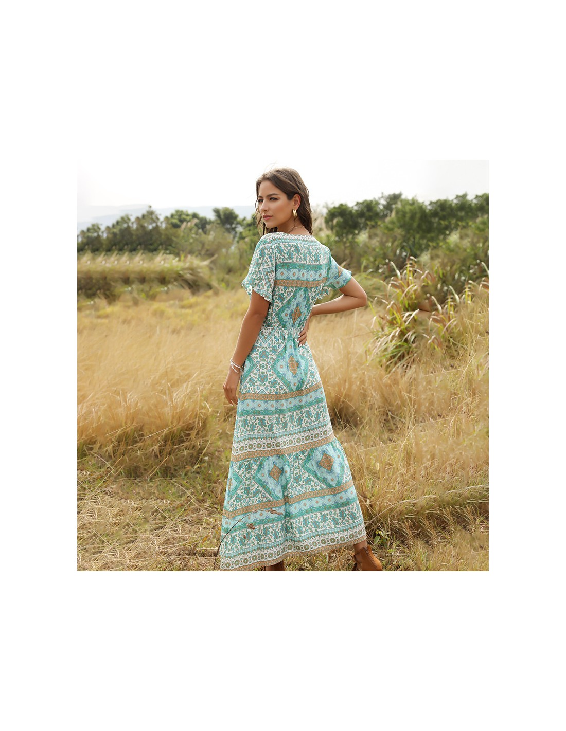 Lange jurk typisch voor de bohemian geest, met turkooisblauwe en beige prints. Het is licht en vrouwelijk en geeft het lichaam een zomerse oppepper.