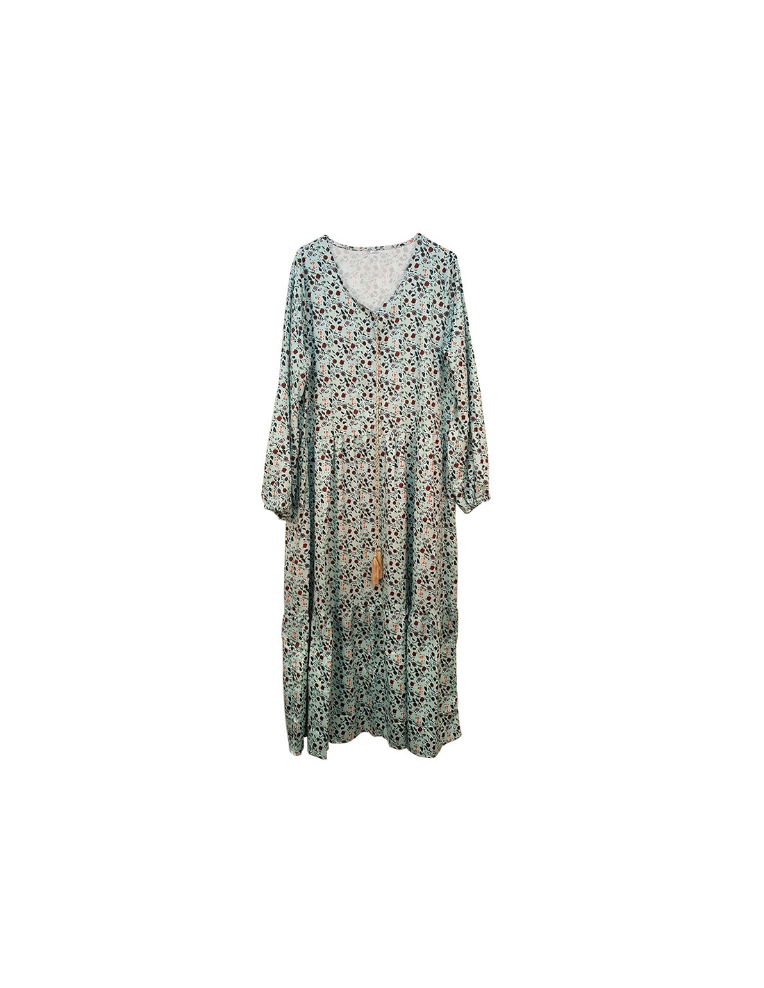 Deze mooie lange jurk is versierd met bloemmotieven, een pure bohemian stijl. Met een pastelgroene achtergrond, variëren de bloemen tussen roodbruin, oudroze en beige. De mouwen zijn lang en hebben een pofeffect. De halslijn wordt gesloten met gouden koordjes van kwastjes.