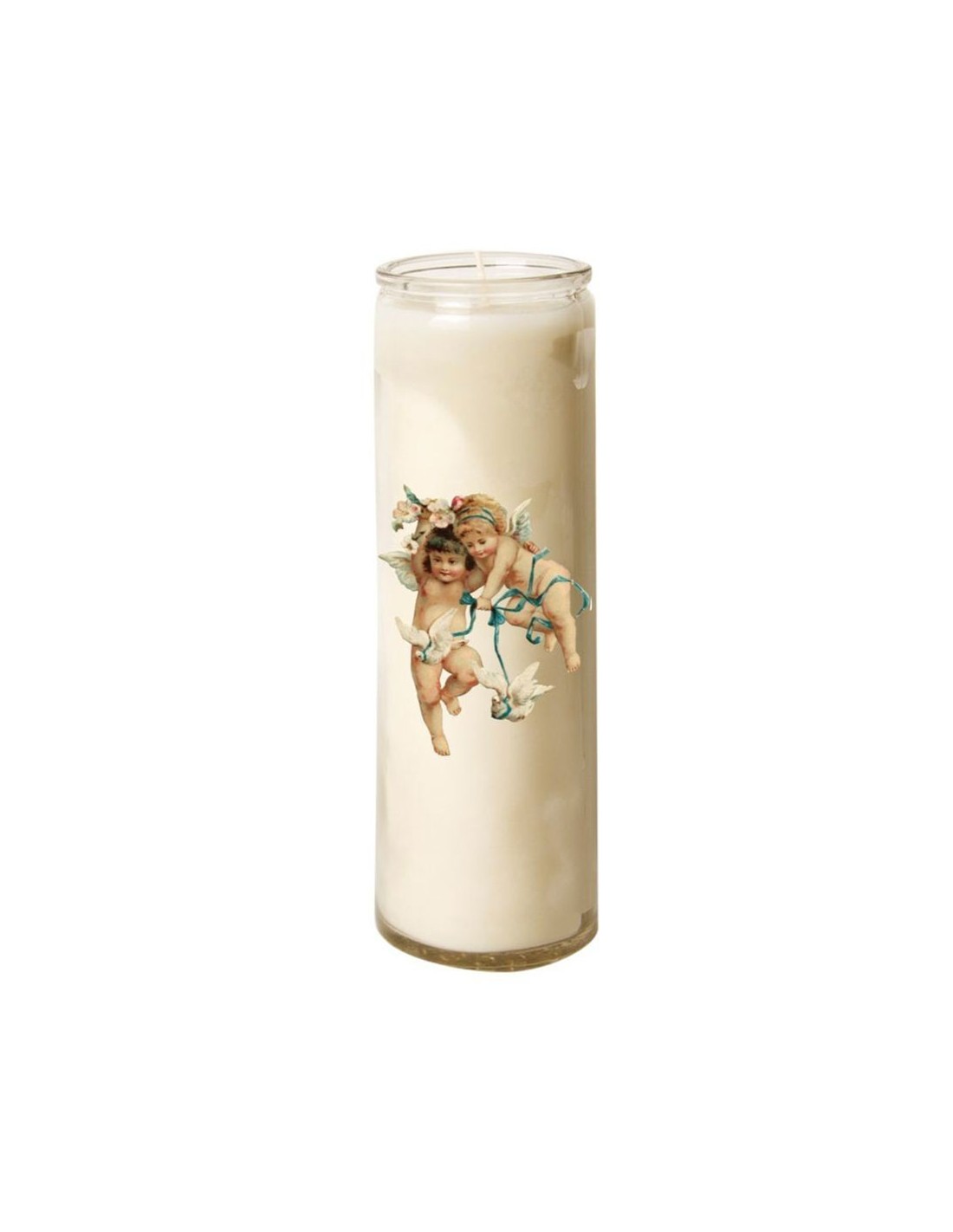 Met een prachtige afbeelding van kleine engeltjes die met duiven lopen als decoratie, kan deze kaars gebruikt worden voor gebed, meditatie, decoratie of esoterie.
