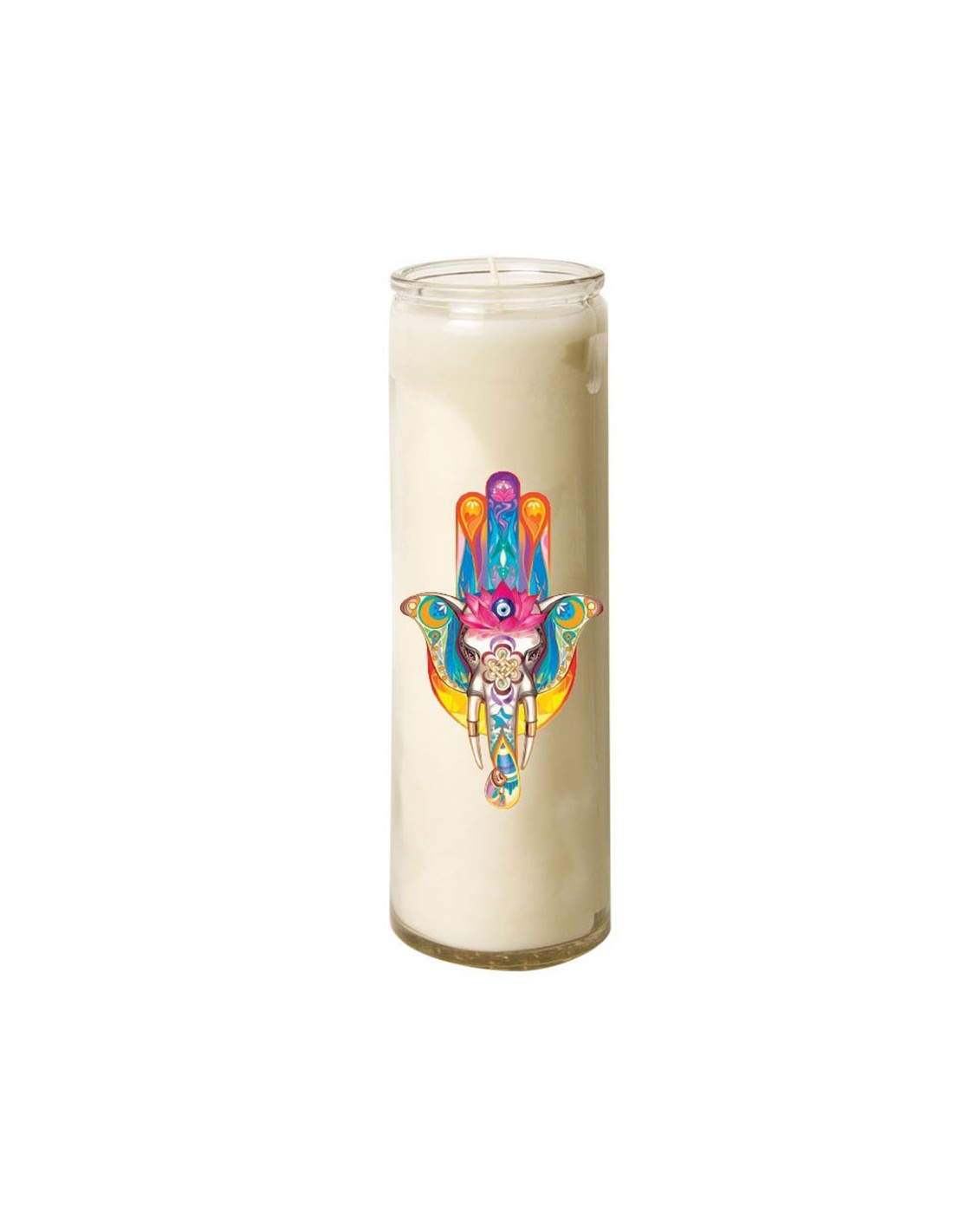 Kaars in een doorzichtige glazen houder, die 7 opeenvolgende dagen kan branden. Van goede kwaliteit, het geeft geen geur af. Met de afbeelding van een gestileerde olifantenkop in de hand van Fatma als versiering, kan deze kaars worden gebruikt voor gebed, meditatie, decoratie of esoterie.