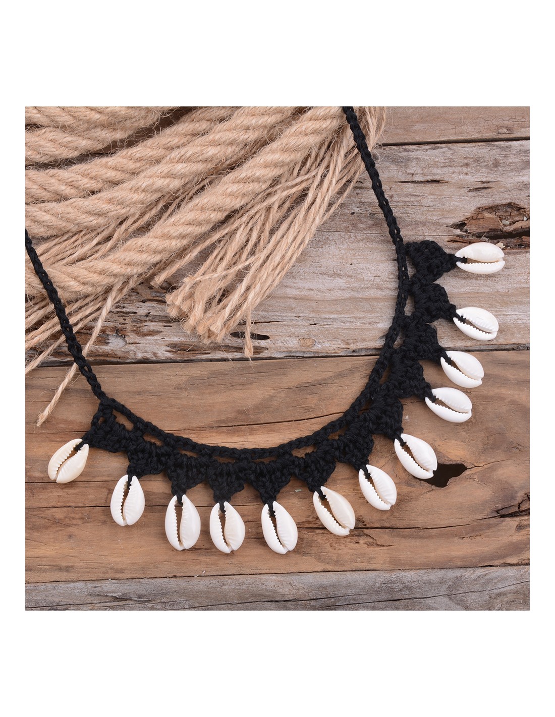 Deze ketting is een onmisbaar zomeraccessoire voor een bohemienachtige en natuurlijke look. Gemaakt in macramé met een zwarte draad en versierd met kaurischelpen, doet het denken aan mooie zandstranden. Deze kleine schelpen worden ook wel porseleingeld genoemd en worden al duizenden jaren door de mens gebruikt. Oorspronkelijk gebruikt als geld, wordt het nu gebruikt in decoratie en juwelen en geeft het een exotisch effect! Dankzij het koordje kunt u deze ketting op de gewenste lengte dragen: als choker met een grote strik of lager op de halslijn met een kortere strik.