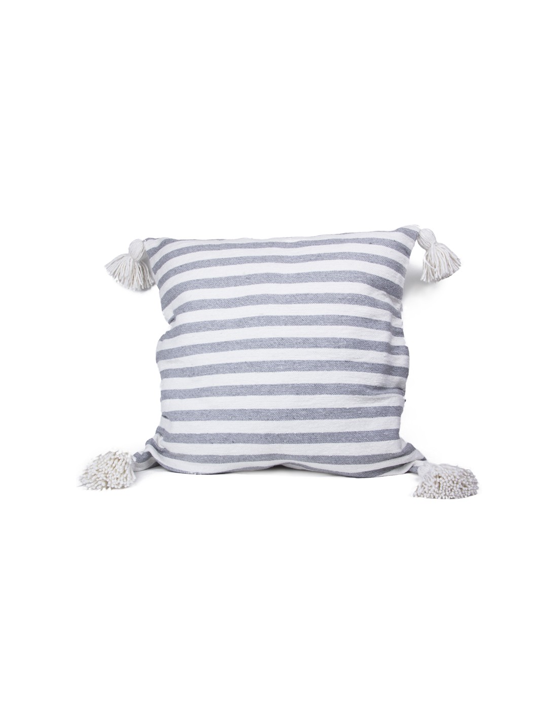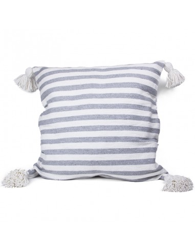Kussenhoes van katoen met grijze en witte lijnen en kwastjes