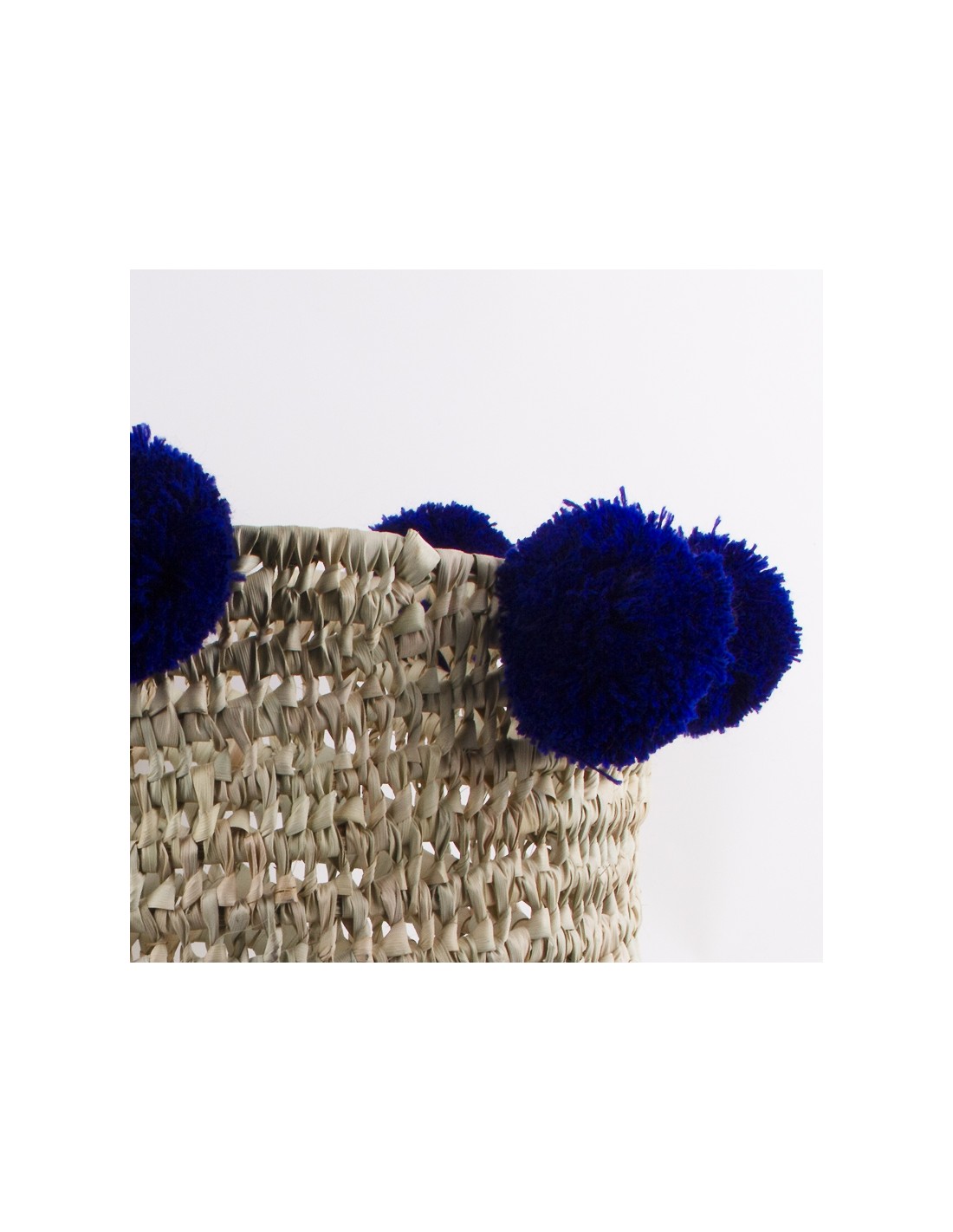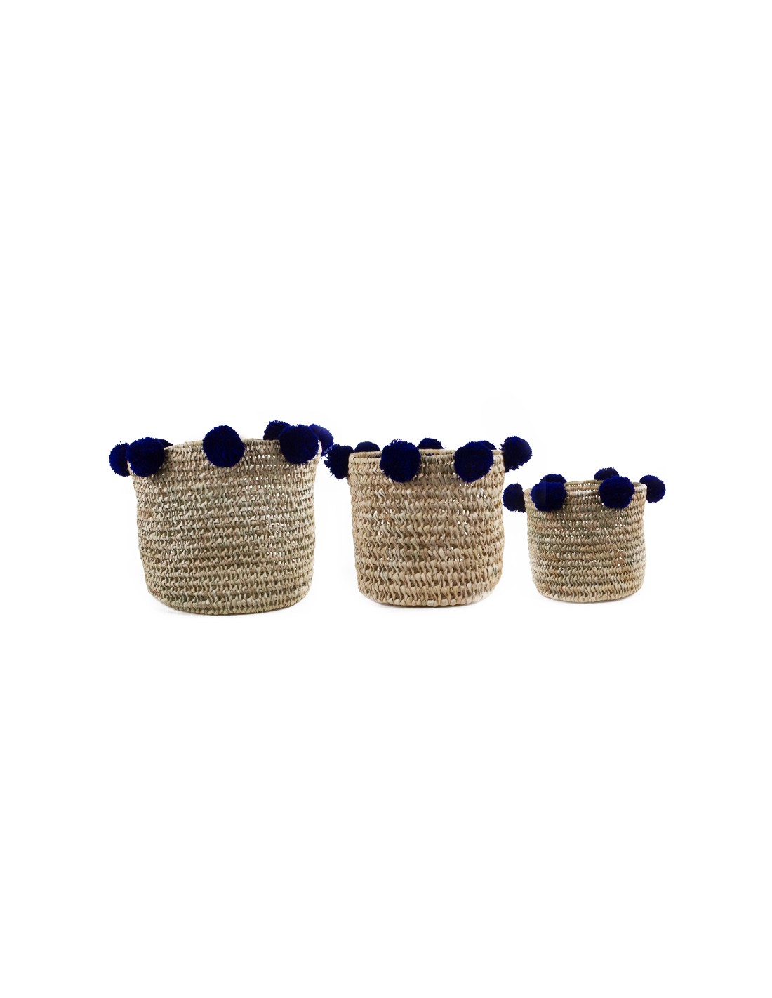 Set van drie ronde geweven manden met kwastjes. De manden zijn nestbaar dankzij hun verschillende afmetingen. Ze zijn volledig met de hand gemaakt en geweven van gedroogde palmbladeren, een lichter en soepeler materiaal dan riet. De zes wollen pompons op elke mand zijn prachtig donker indigoblauw.