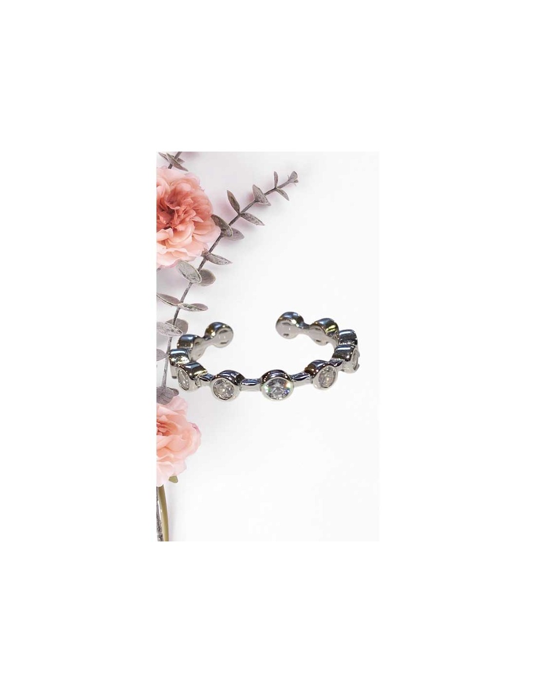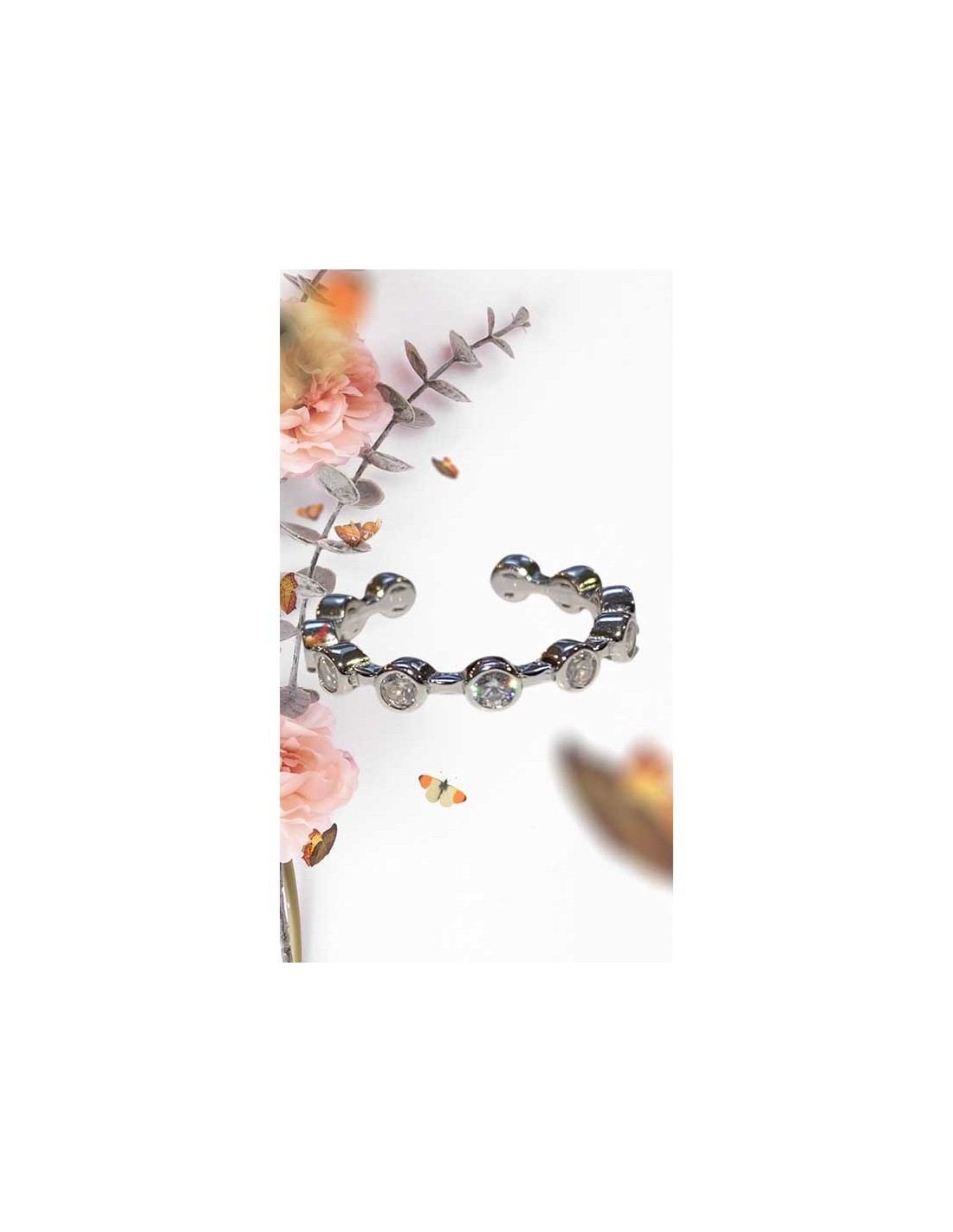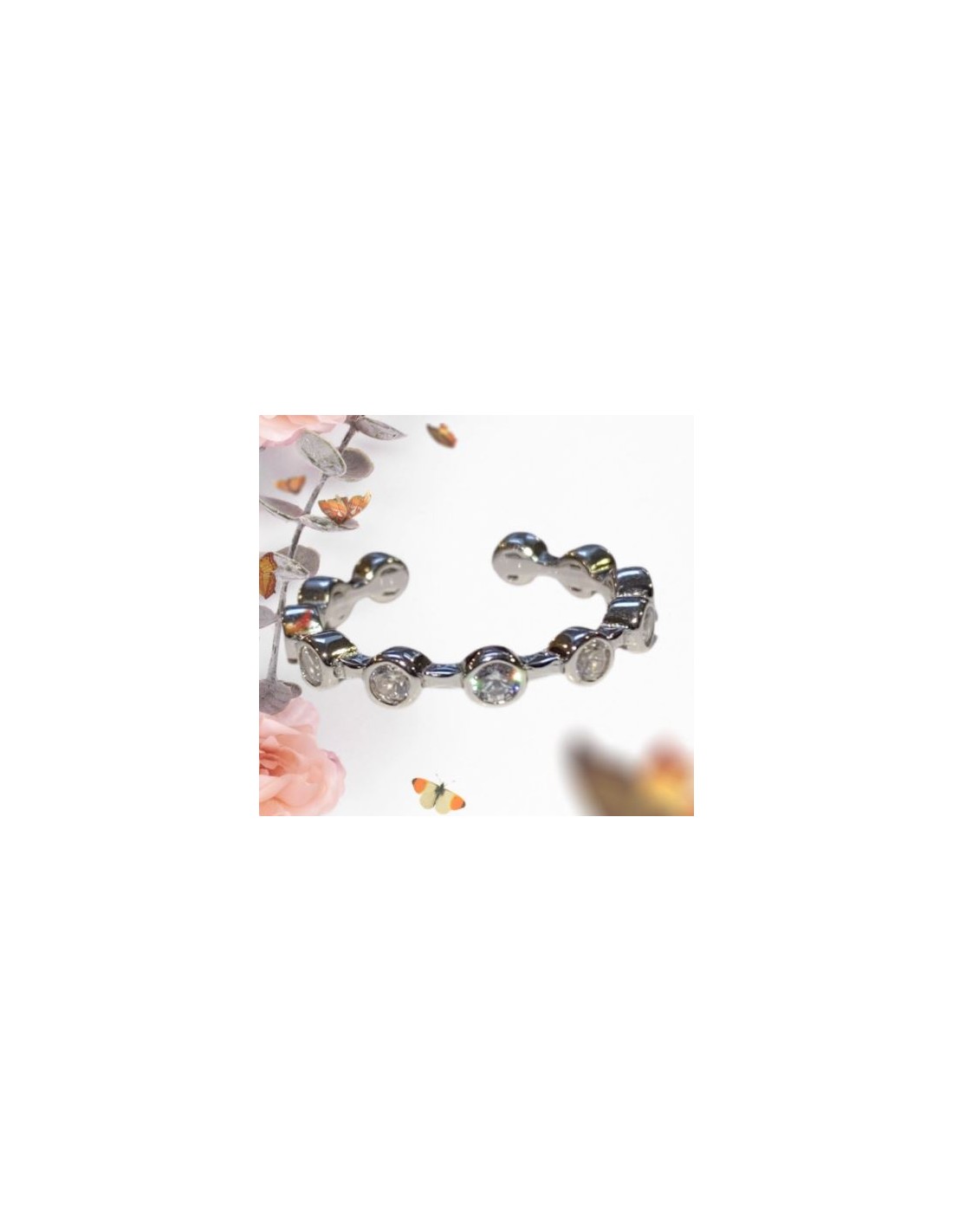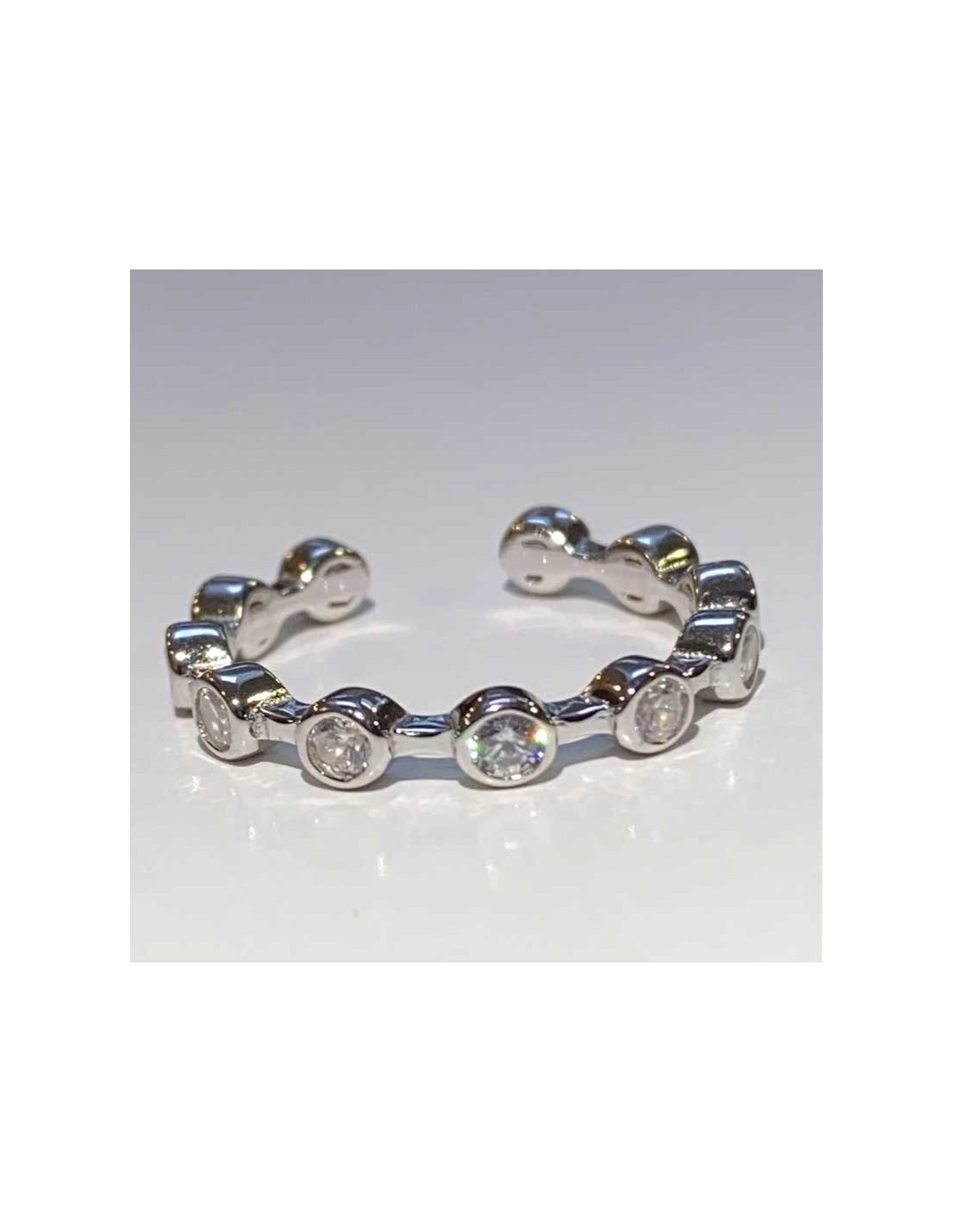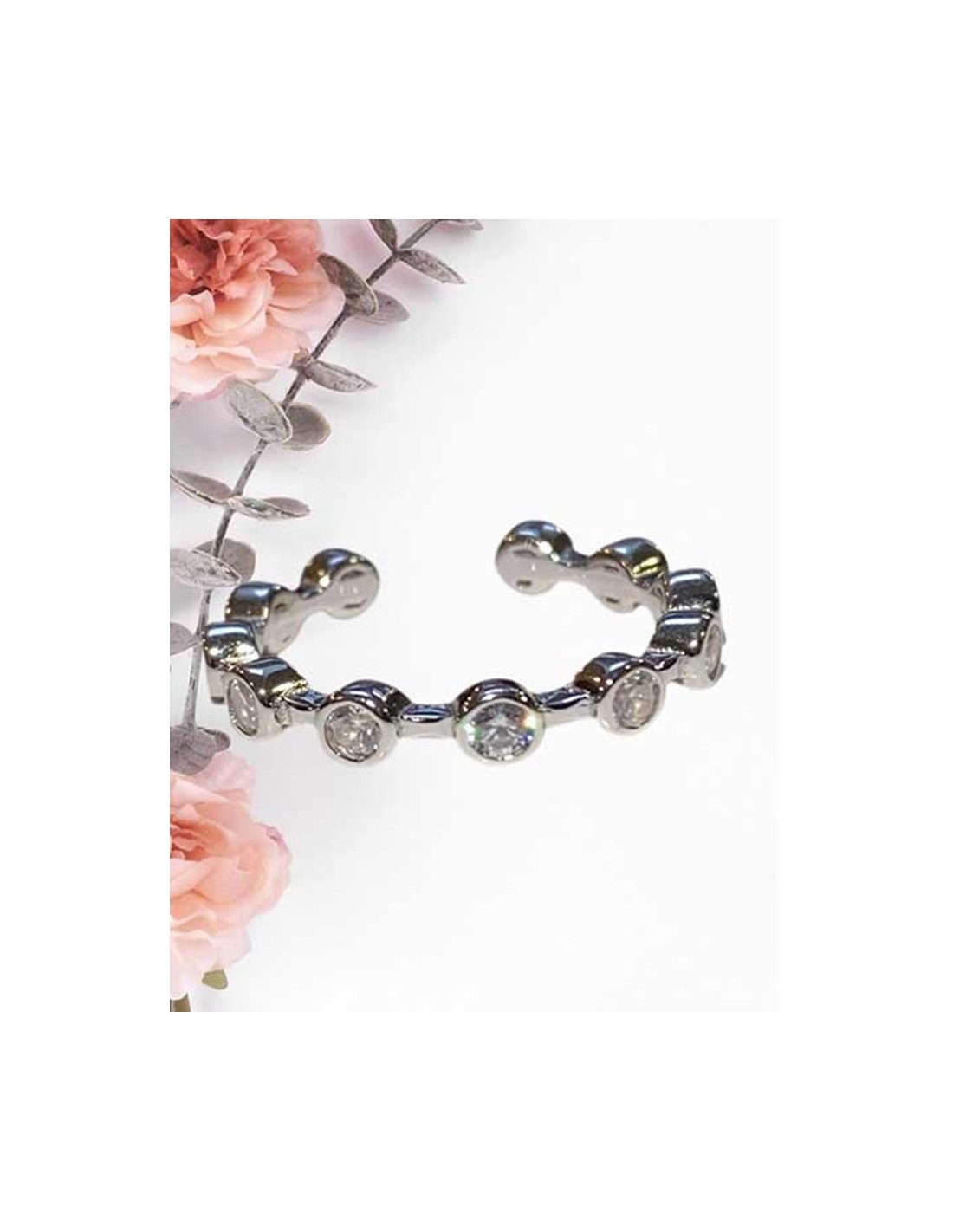 Deze ring past op alle vingerafmetingen dankzij zijn open vorm. De ring is ingelegd met 11 zirkonia kristallen en heeft een ronde vorm.