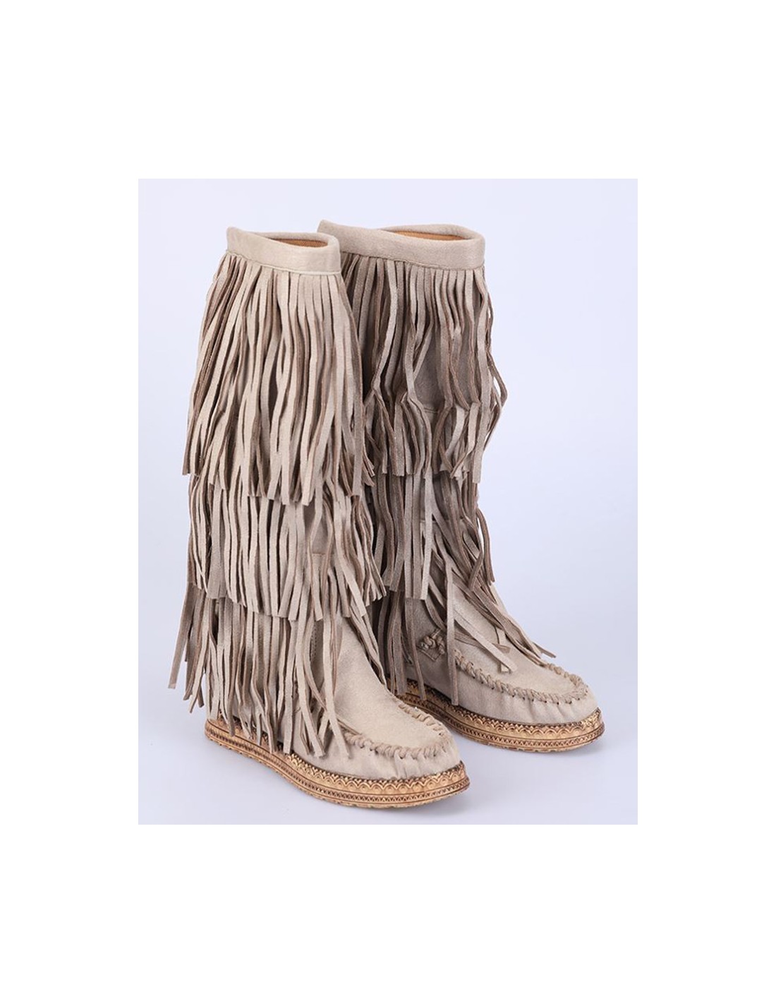 Beige laarzen met franjes, 100% kunstleer. Deze Minnetonkas zijn een bohemian stijl perfect voor het tussenseizoen en het koude seizoen! De laars heeft een hak die de voet omhoog brengt, verborgen in de laars.