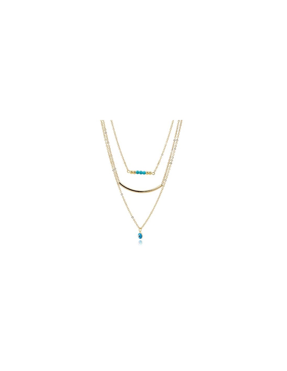 Trendy ketting in boho-stijl met drie rijen kettingen. De laatste rij heeft een beschermende ooghanger.