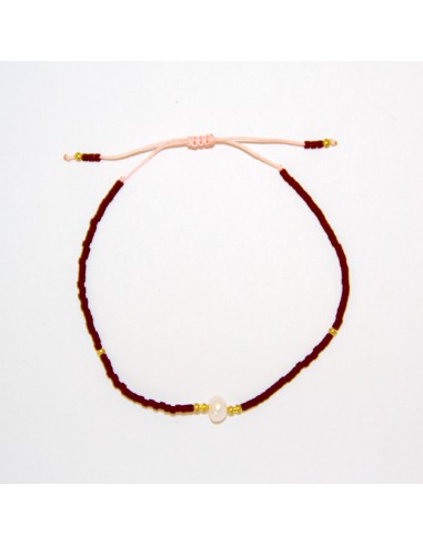 Deze delicate en fijne armband is in het midden versierd met een echte parelmoeren parel, zelf omringd door gouden parels die haar accentueren. Andere gouden parels stippelen elegant de draad van de armband en de uiteinden ervan uit als lichtgevende accenten om het geheel op te fleuren. De macramé-knoop weerspiegelt de parelmoeren kraal, en de vliegende draden versierd met vier parels zorgen voor een lichte en subtiele toets.
