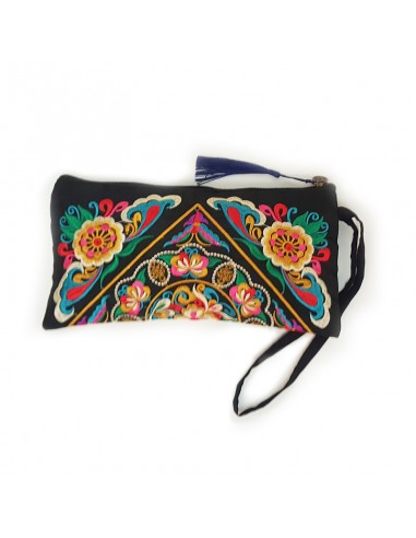 Zwart stoffen tasje, geborduurd met bloemen- en plantenmotieven over de hele oppervlakte. Met haar glinsterende gekleurde draden is deze tas een chique en bohemienachtige aanwinst voor een uitstapje of een uitstapje als badtas. Het interieur is verdeeld in twee compartimenten voor een betere organisatie. De ritssluiting is versierd met een donkerblauwe pompom en een yen-achtig gat. De riem maakt het gemakkelijk te dragen.