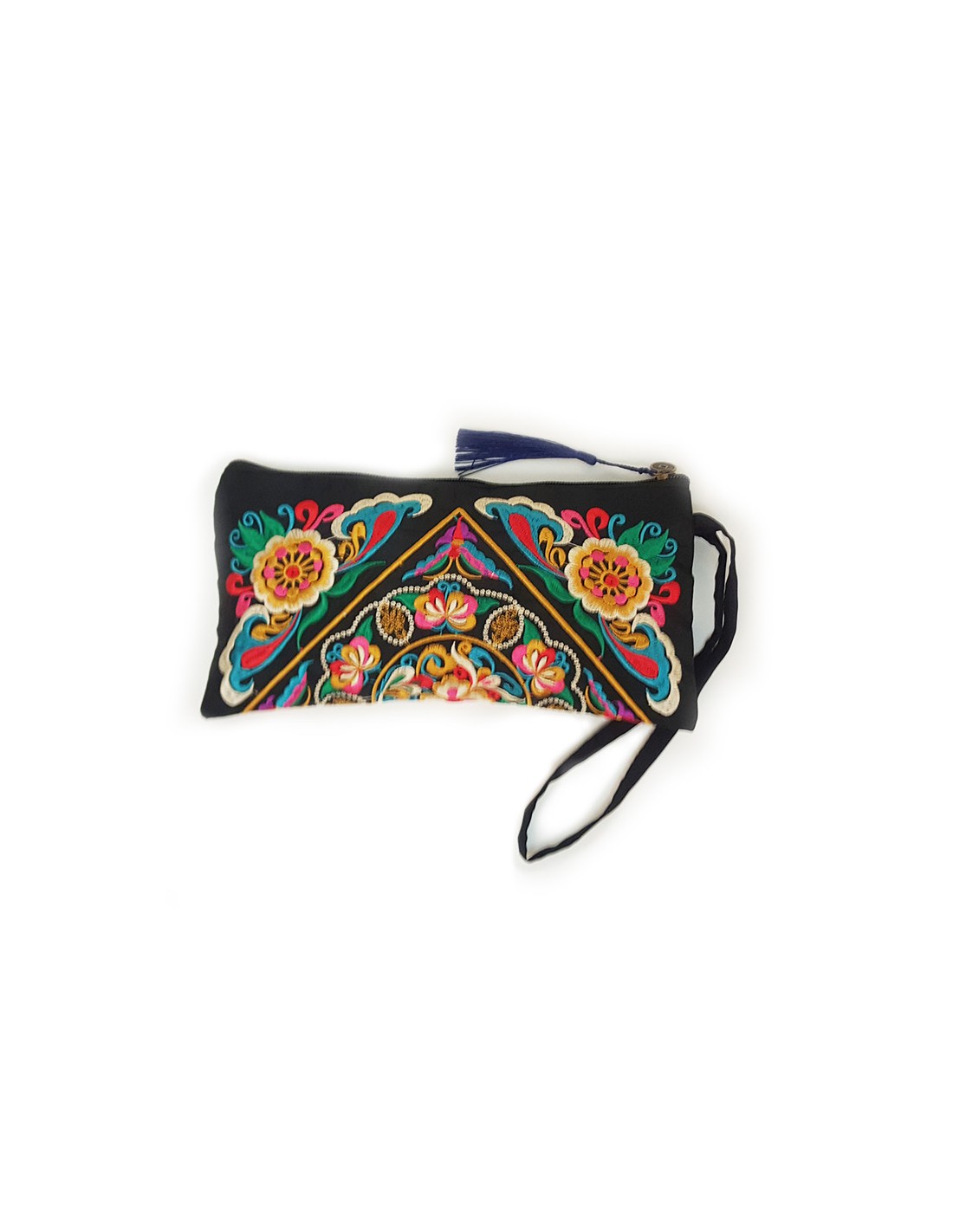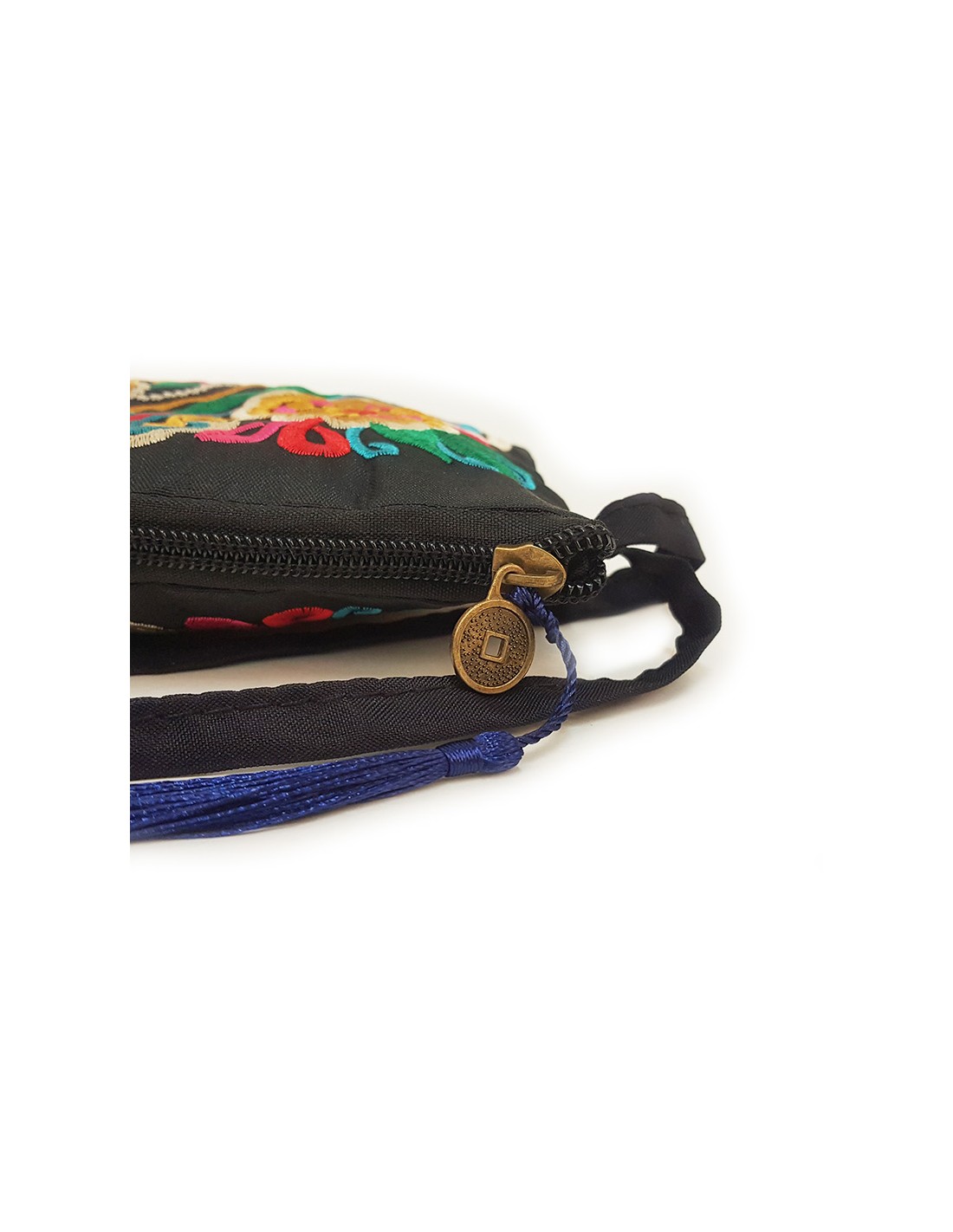 Dit buideltje is geborduurd met delicate en kleurrijke bloemmotieven op een zwarte achtergrond en versierd met een donkerblauwe pompom. De rits is in de vorm van een munt met een gat als een yen.