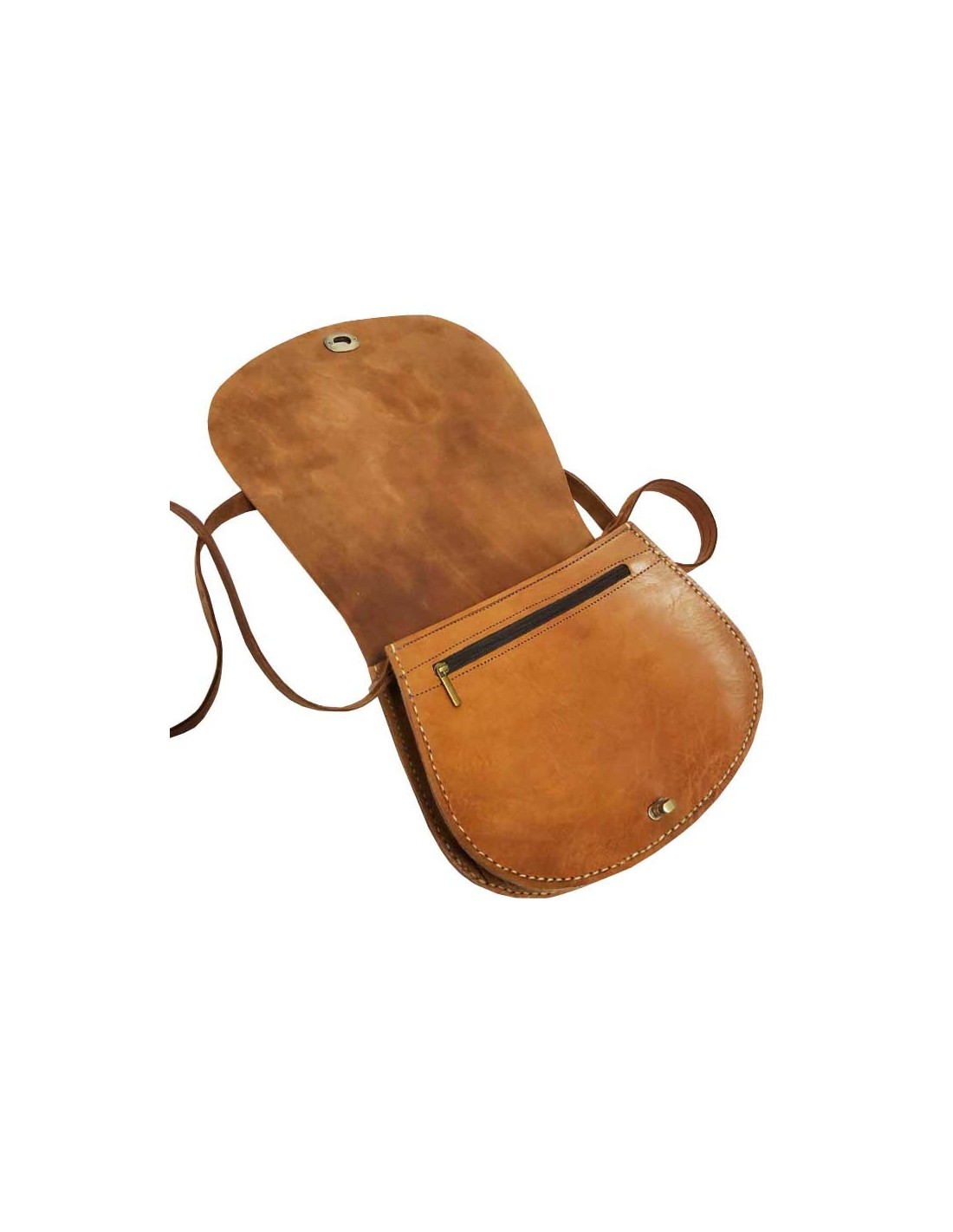 Leren schoudertas, volledig met de hand bewerkt door ambachtslieden. Het leer van deze tas is dik en sterk. Een bronskleurige metalen gesp houdt de tas goed gesloten. Eenmaal open is er een groot centraal vak voor je benodigdheden en een vak met rits aan de voorkant.
