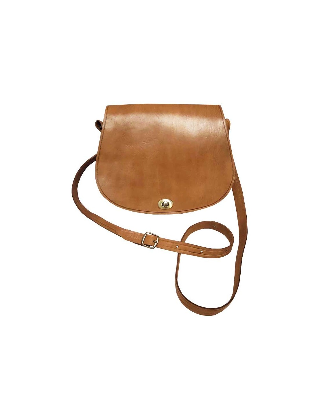 Verstelbare schoudertas van stevig, handbewerkt leer, met bronskleurige metalen gesp. De tas heeft een klein voorvak en een groot vak.