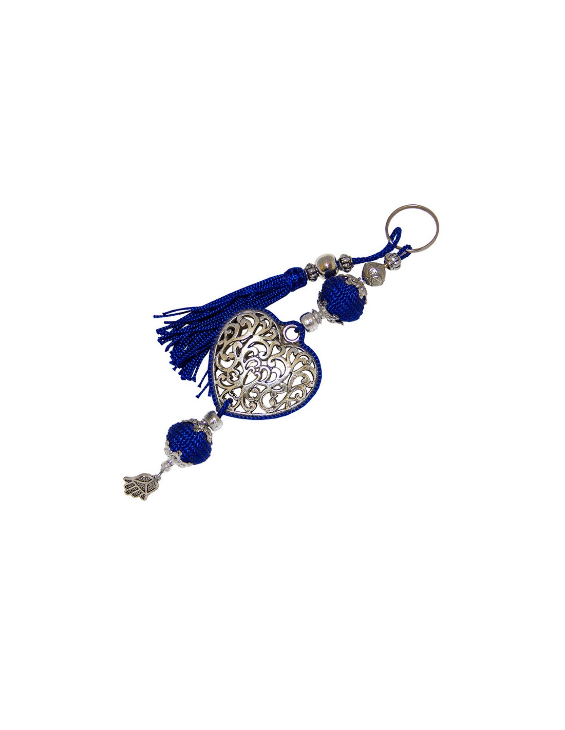 Verzilverde metalen sleutelhanger in de vorm van een hart, versierd met arabesken en versierd met een hand van Fatma en een pompom, alles in een diepblauwe kleur.