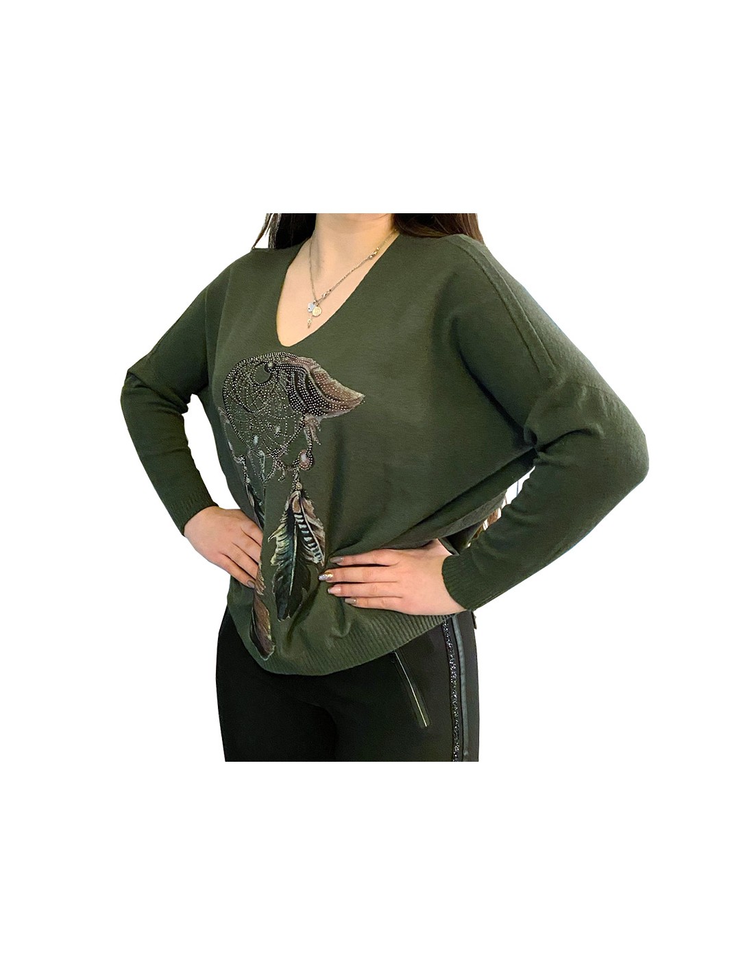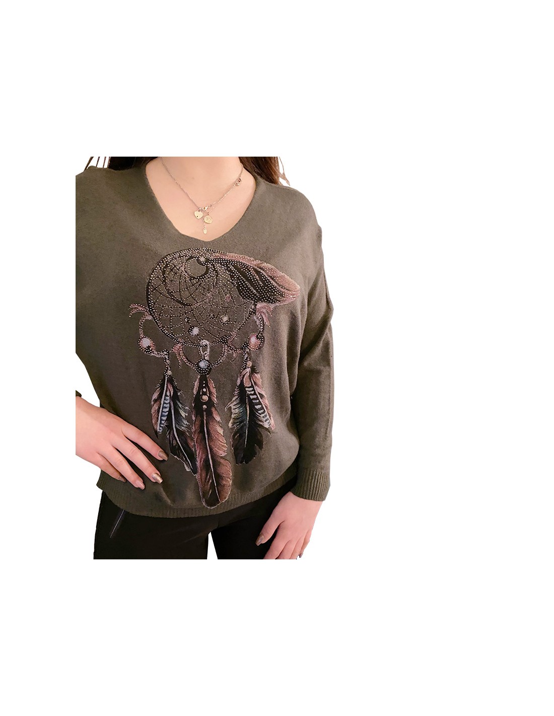 Losvallende viscose groene of grijze trui met dromenvangersmotief op de voorkant. De U-vormige halslijn laat de hals en de borst ademen. De lange, nauwsluitende mouwen geven de trui een slanke pasvorm, waardoor praktisch en ontspannen samengaan.