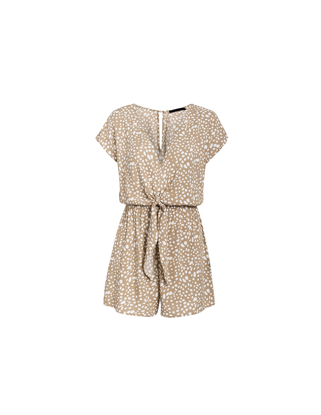 Korte en lichte overalls van polyester en katoen. Met een beige achtergrond en witte stippen is het een perfect boho kledingstuk !